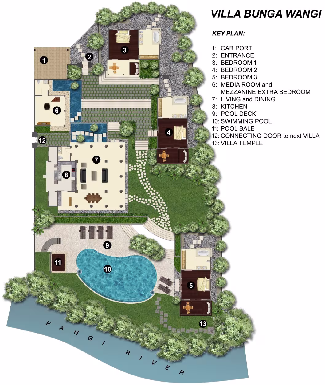 From the Balinese entrance gates to the villa grounds, one finds oneself descending the white palimanan stone steps through the landscaped gardens to the extraordinary ten metre high main living/dining pavilion which overlooks the natural green stone swimming pool nestled adjacent to the Pangi River.