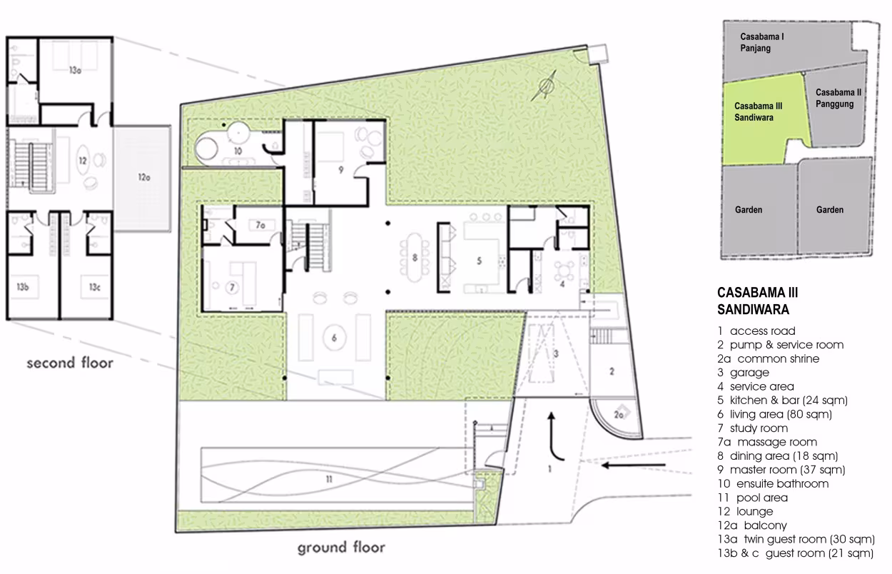 Inspired by traditional Balinese Village clusters, the villa boasts elements derived from local architecture combined with original modern design, great style and detailed attention to comfort Villa Casabama III Sandiwara is fully self contained with private entrance, own grounds, garage and pool – yet has easy access to the neighbouring villas via a common gate if required. A well-equipped gym / yoga room at the front of the property is shared by the three villas in the complex, while between the villas and the ocean lies a beautiful, grassy, coconut grove - perfect for romantic weddings and events!