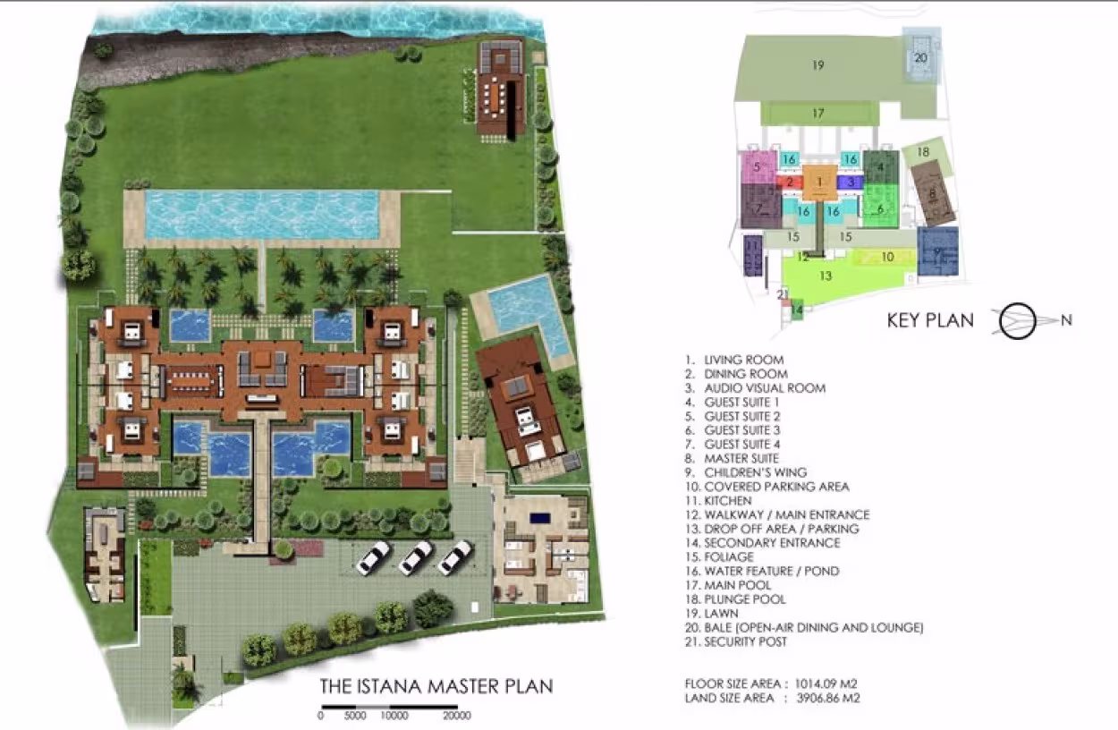 The Istana boasts a total of 5 bedroom suites (each with double beds) and 2 children bedrooms that can sleep up to a total of ten adults and 4 children. The 2-bedroom games and children’s wing can sleep up to four small children and infants and two domestic staff. The master-suite is in its own building to the north side of the property featuring a deck and a small private swimming pool. Looking at the central building – it’s in a rough ‘H’ shape; with each end of the ‘H’ possessing a bedroom. Looking at the ocean, the two symmetrical wings attached to the living room accommodate dining room to the left (the south), and the television room to the right (the north).