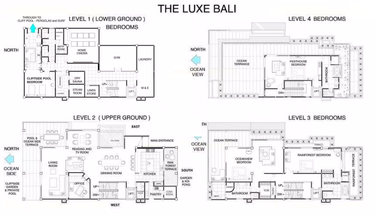 All four floors of The Luxe Bali are wheelchair accessible via the 6-person elevator. The villa also offers a Gym (which easily converts into a children’s room), Swedish Sauna, Steam Room and a Spa manned by two fully trained therapists. A climate-controlled Home Theatre features a 3 metre diagonal screen and leather reclining chairs, including a double love seat. A Smart Home System, programmed for easy, intuitive use by the Guest, controls the lighting, music, CCTV and alarm system – one can run the villa from one’s chair – or bed! Instant hot water, constant water pressure and micro-filtered, UV-treated, fully-drinkable rainwater for the showers, vanities and baths are but a few of the unique features illustrating the attention to detail which is the leitmotif of this unique property.