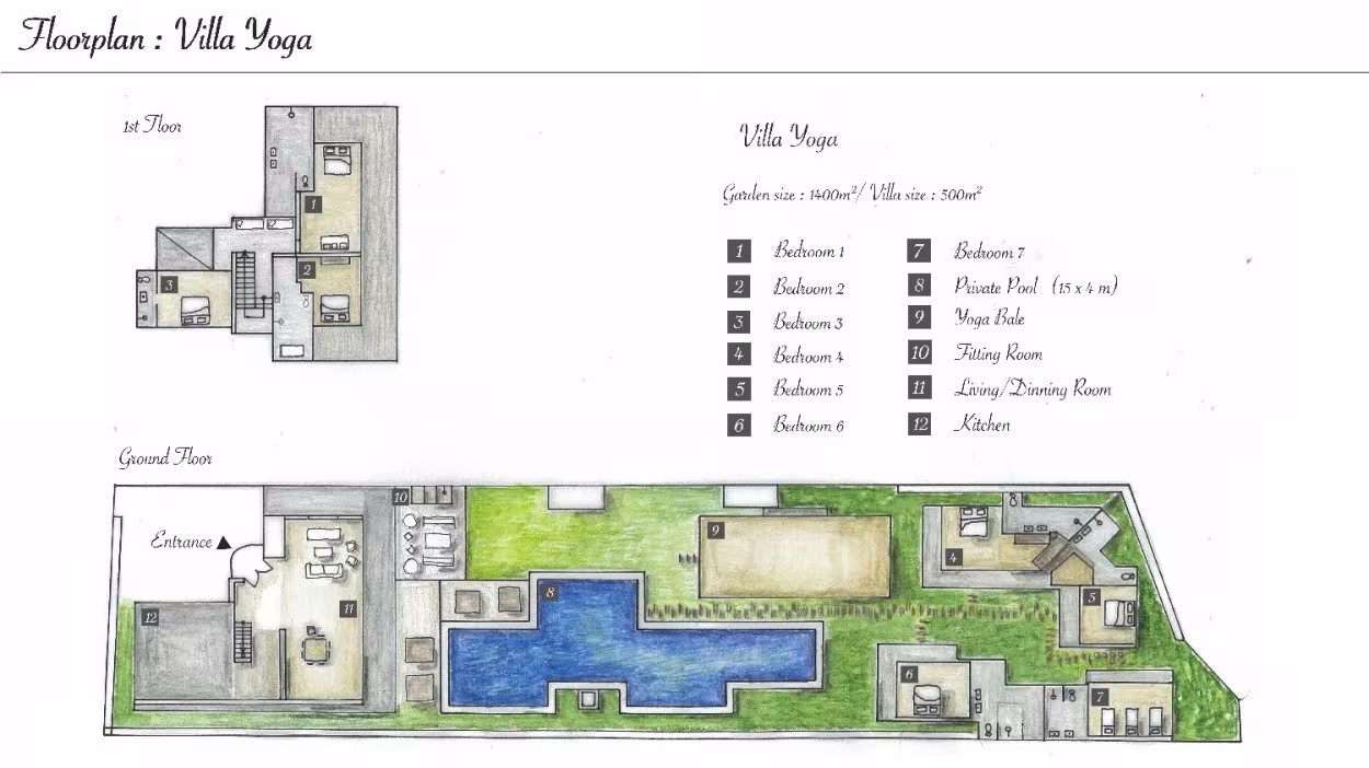 Villa Yoga can accommodate up to 14 guests in the 7 deluxe villa suites found within the estate. All the bedrooms feature air-conditioning, big wardrobe closets, private veranda's with garden view and wonderful private en-suite bathrooms fitted with tropical alfresco rain-showers. The main house of villa Yoga houses 3 of the bedrooms on the first floor, including the opulent master suite. Two of these rooms are adjoined to a beautiful teak wooden terrace where you can wake up slowly, gazing at the lovely view over the garden and pool. The master room boasts a large bathtub to soak in for ultimate relaxation. The other four bedrooms are tucked in private garden bungalows. All of these secluded bedrooms are fitted with king-size or twin-beds which can be joined together to make one large double or even a triple-bed for a restful night sleep. The garden-like en-suites give great possibilities for showering beneath Bali's beautiful starlit sky in the ambiance of tropical greenery and natural river stones.